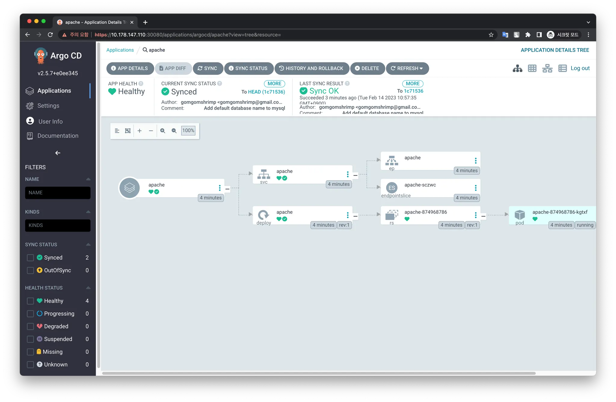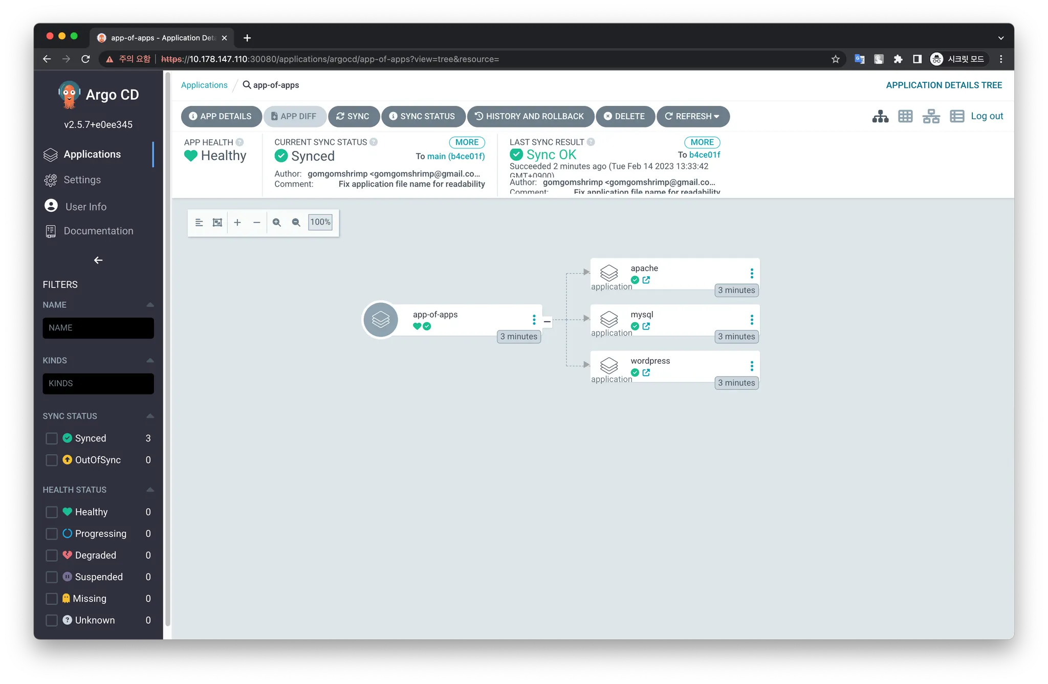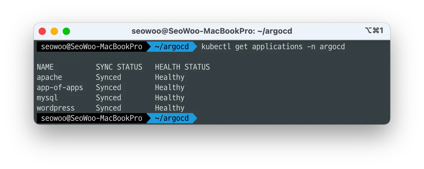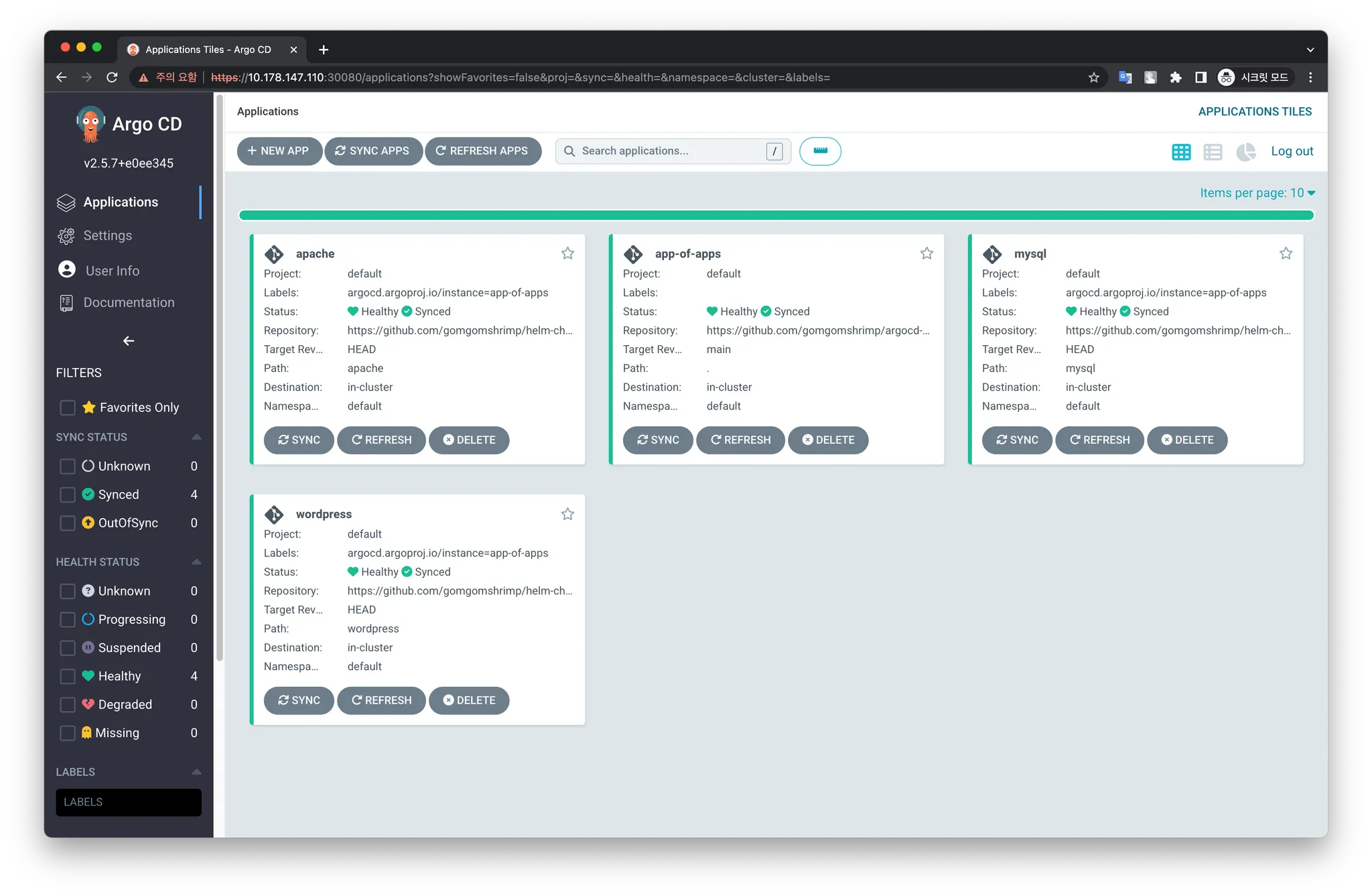 배포결과로 app-of-apps라는 application과 apache, mysql, wordpress application들이 생성되어 총 4개의 application이 생성된 것을 확인할 수 있습니다.