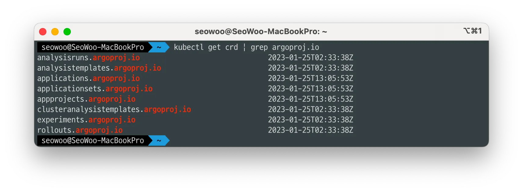 Argo CD를 설치하고 CRD를 확인해보면, 아래처럼 application이라는 커스텀 리소스를 확인할 수 있습니다.