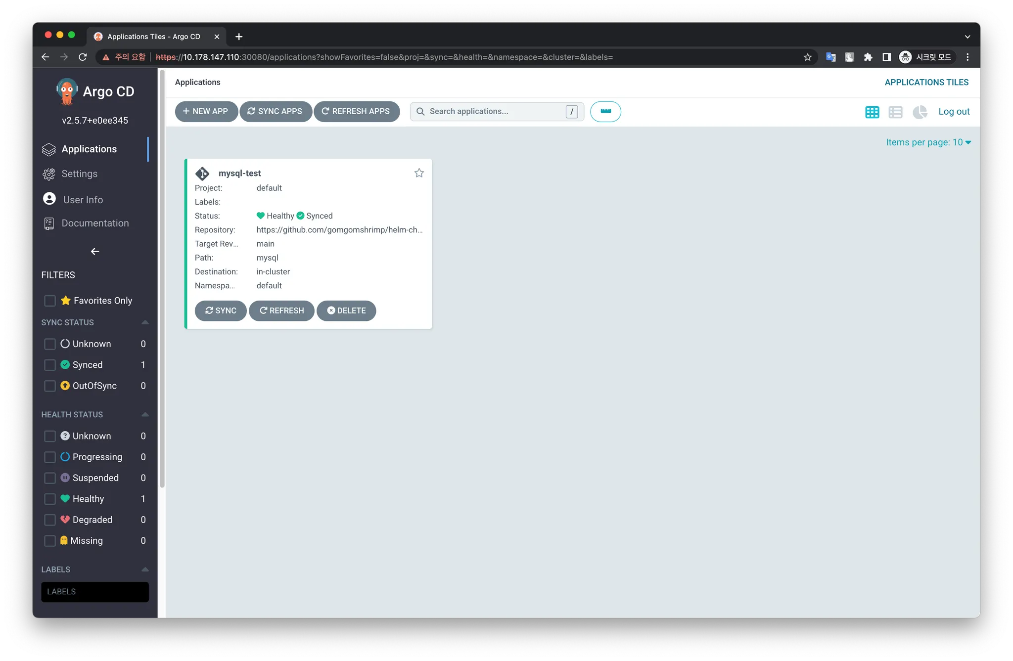 Web UI에서 생성한 mysql-test application 리소스를 확인할 수 있습니다.