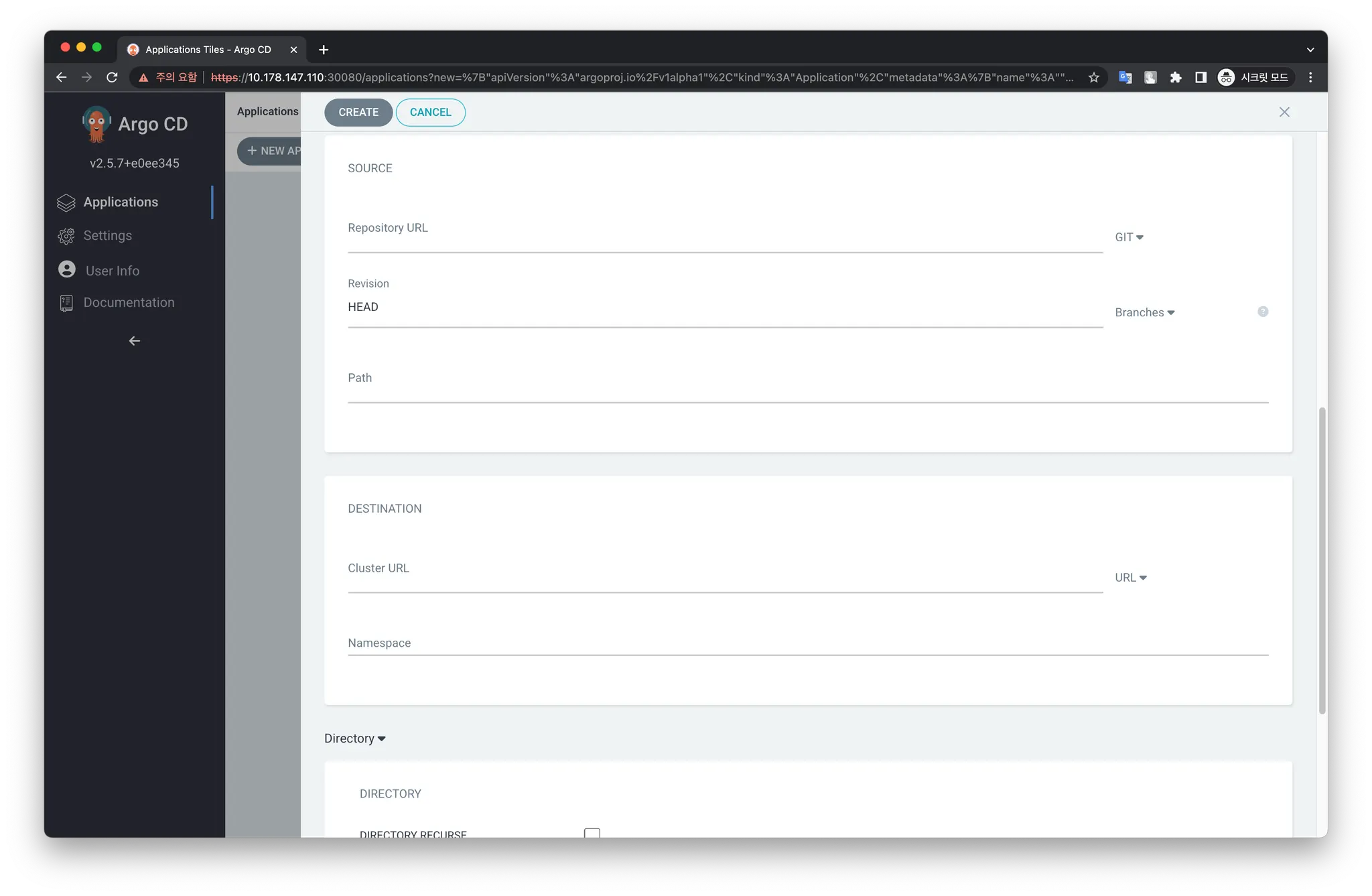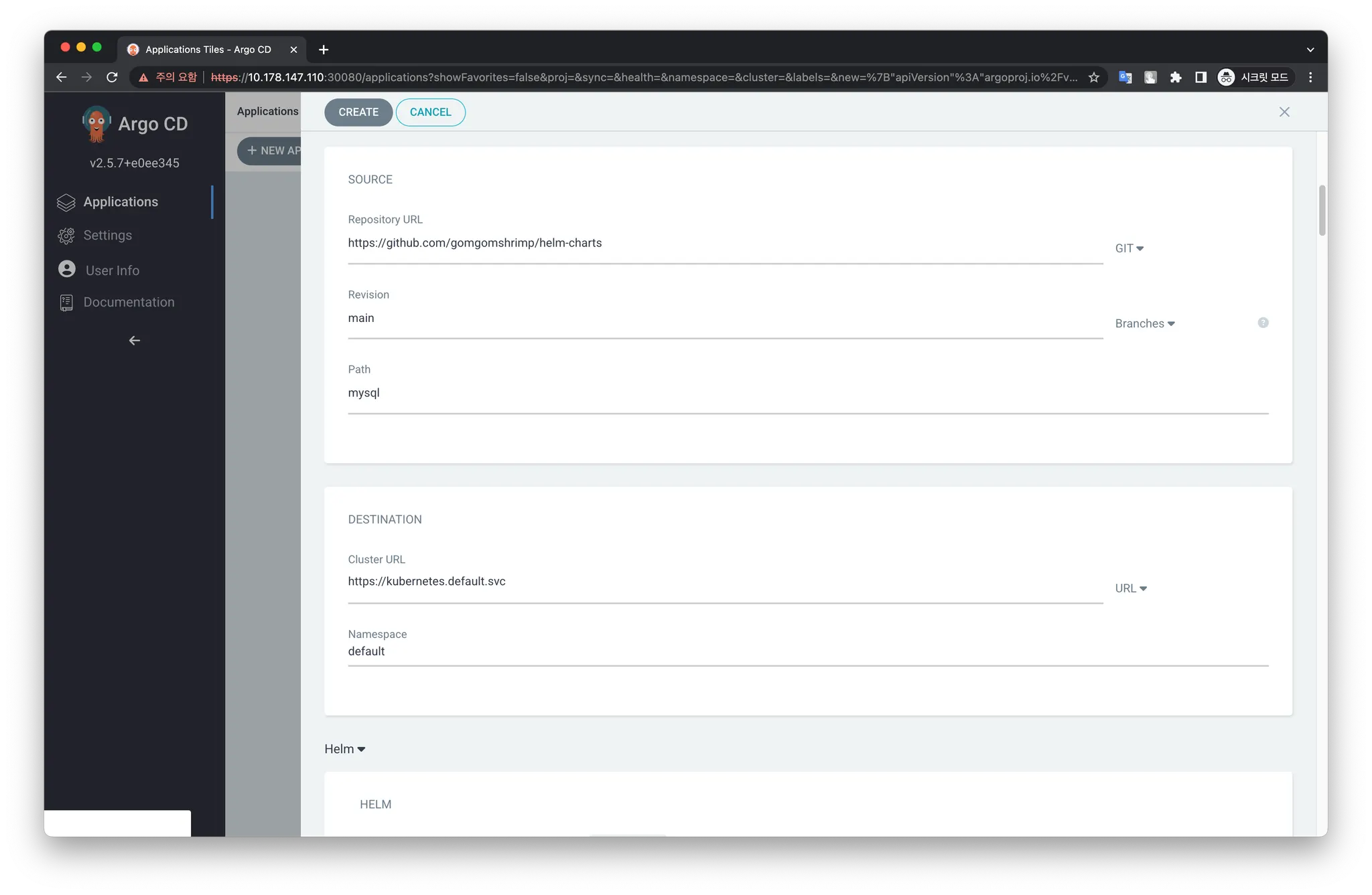 지금은 Argo CD가 배포된 클러스터에 배포하므로 https://kubernetes.default.svc 를 사용합니다.
