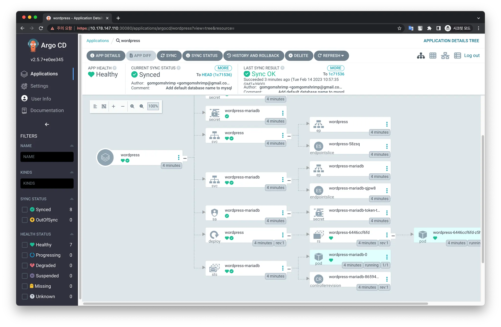 자세히 살펴보면, 위의 3개 application들의 Source가 각각 https://github.com/gomgomshrimp/helm-charts 의 apache, mysql, wordpress path를 지정하고 있는 것을 알 수 있습니다.