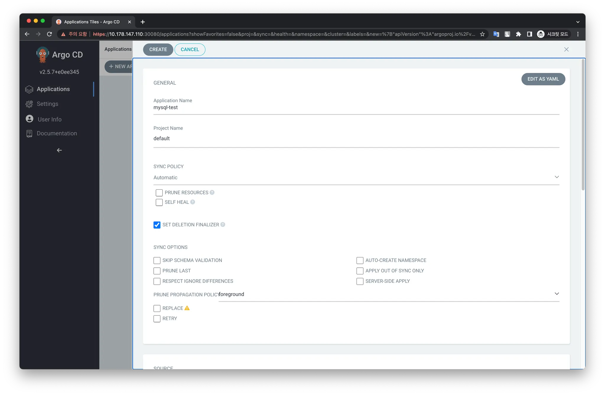 이제 위처럼 mysql-test 라는 App을 생성해보겠습니다. mysql-tet App에 관한 정보, Source, Destination 정보 등을 작성하고 App을 생성하면 mysql이 클러스터에 쉽게 배포된 것을 확인할 수 있습니다.