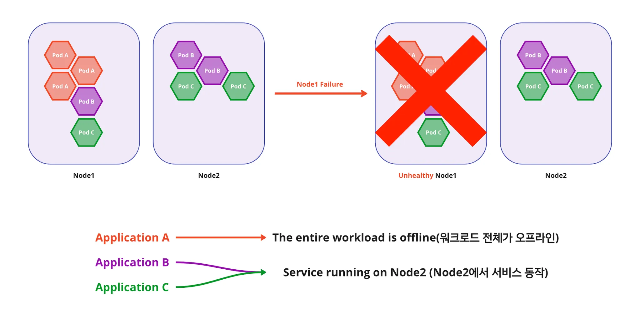 아래 그림처럼 Pod A는 Node 1에 모두 스케줄되어있습니다. 이 때 Node 1에 장애가 생긴다면, 다른 워커 노드에는 Pod A replica가 없기 때문에 서비스 A는 정상 동작을 할 수 없게됩니다.