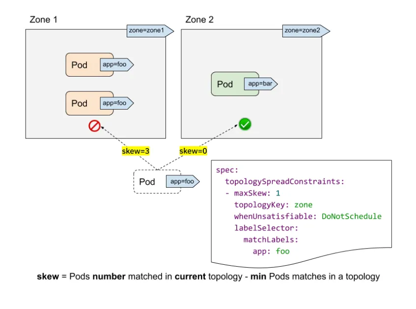 만약 zone1에 추가 app: foo 라벨 Pod를 배치하면 전역 최솟값은 계속 0인데, zone1 에 Pod가 3개가 되어 skew=3이 되고 maxSkew=1을 위반하게 됩니다.