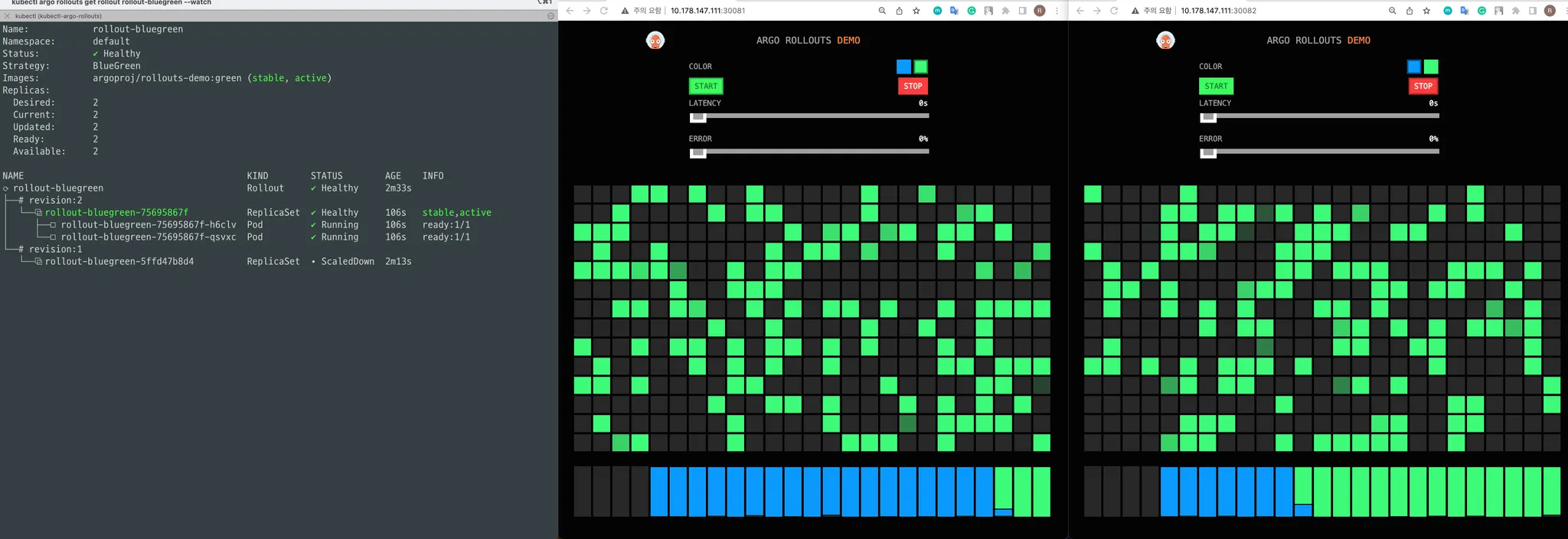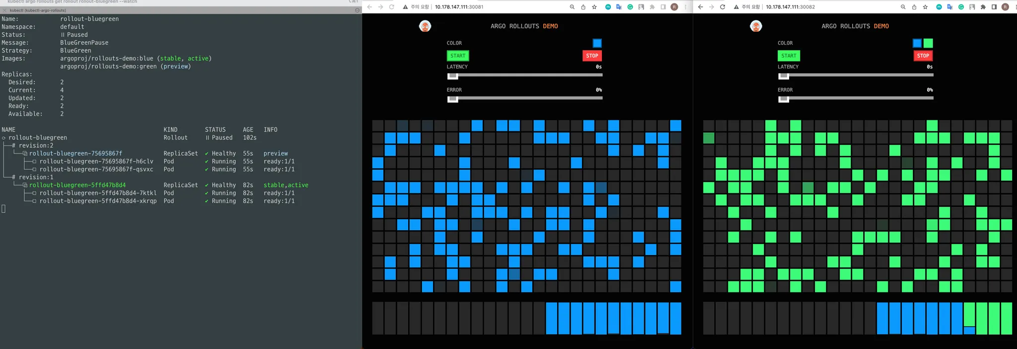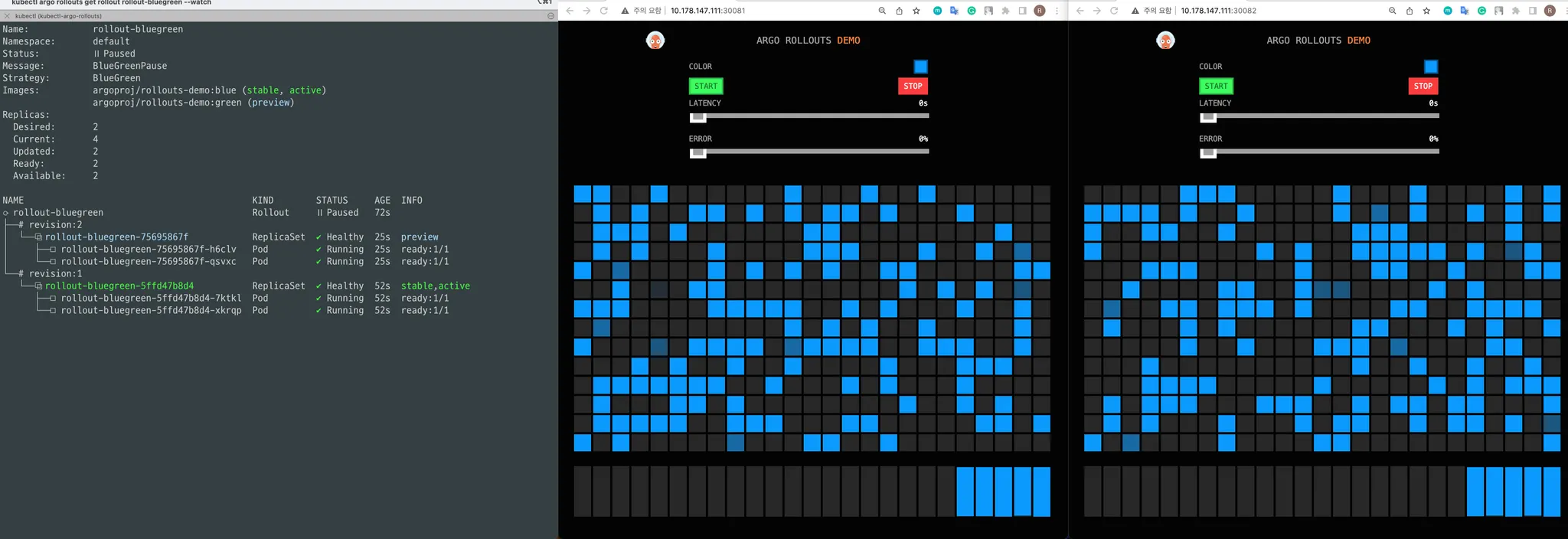 위 Rollout 리소스를 이제 배포한 뒤 아래와 같은 변화 과정을 테스트 해보겠습니다.