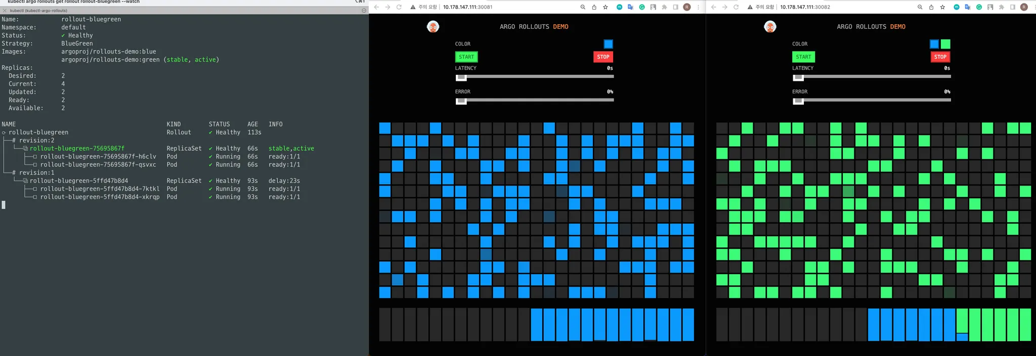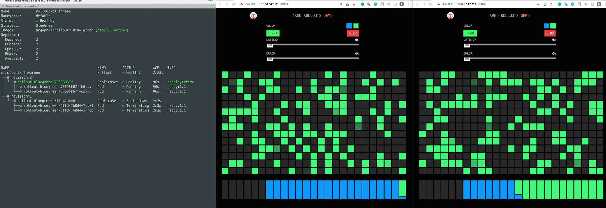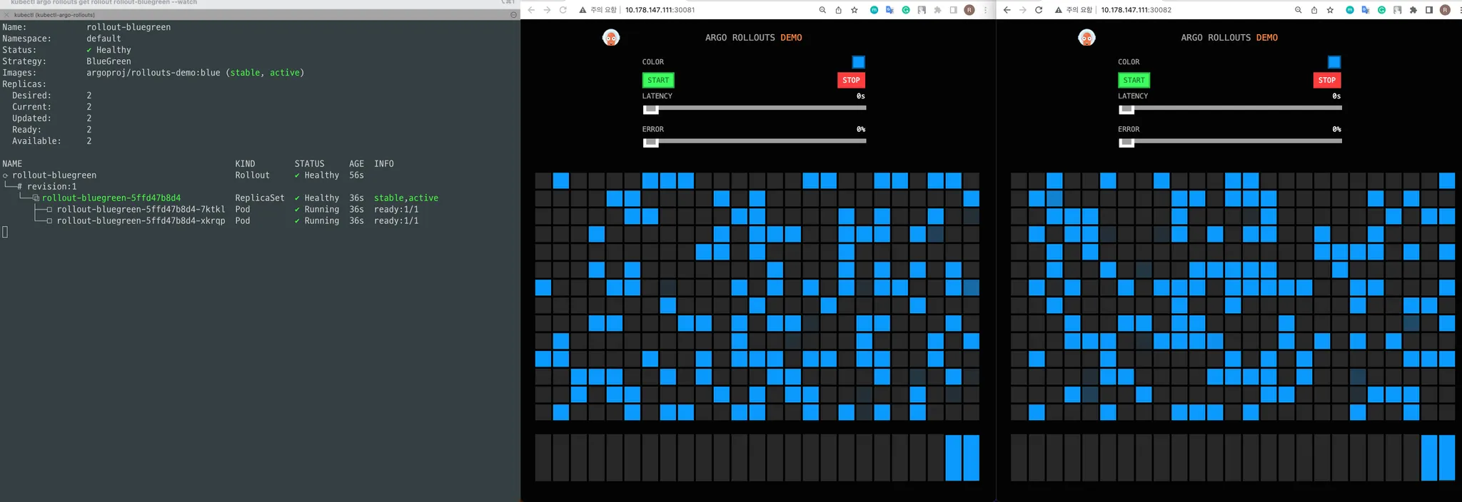 위 Rollout 리소스를 이제 배포한 뒤 아래와 같은 변화 과정을 테스트 해보겠습니다.