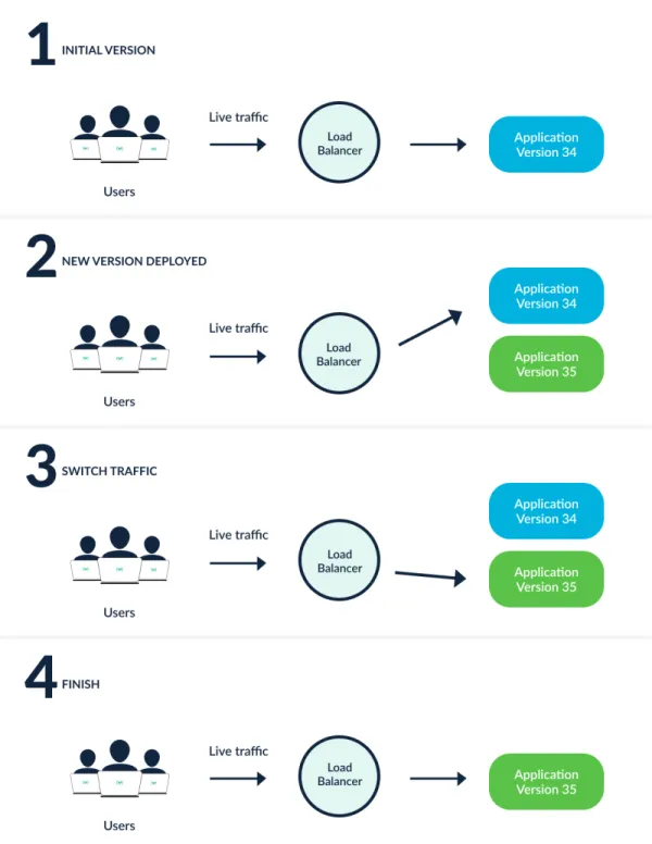 조금 더 자세히는, Blue를 구버전, Green을 새로운 버전으로 가정한다면, 운영 환경에 기존 버전인 Blue와 동일하게 새로운 Green 버전의 인스턴스를 구성하고, 테스트를 완료 후 라이브 트래픽을 로드밸런서를 통해 새로운 버전으로 전환하는 형태의 배포 방식입니다.