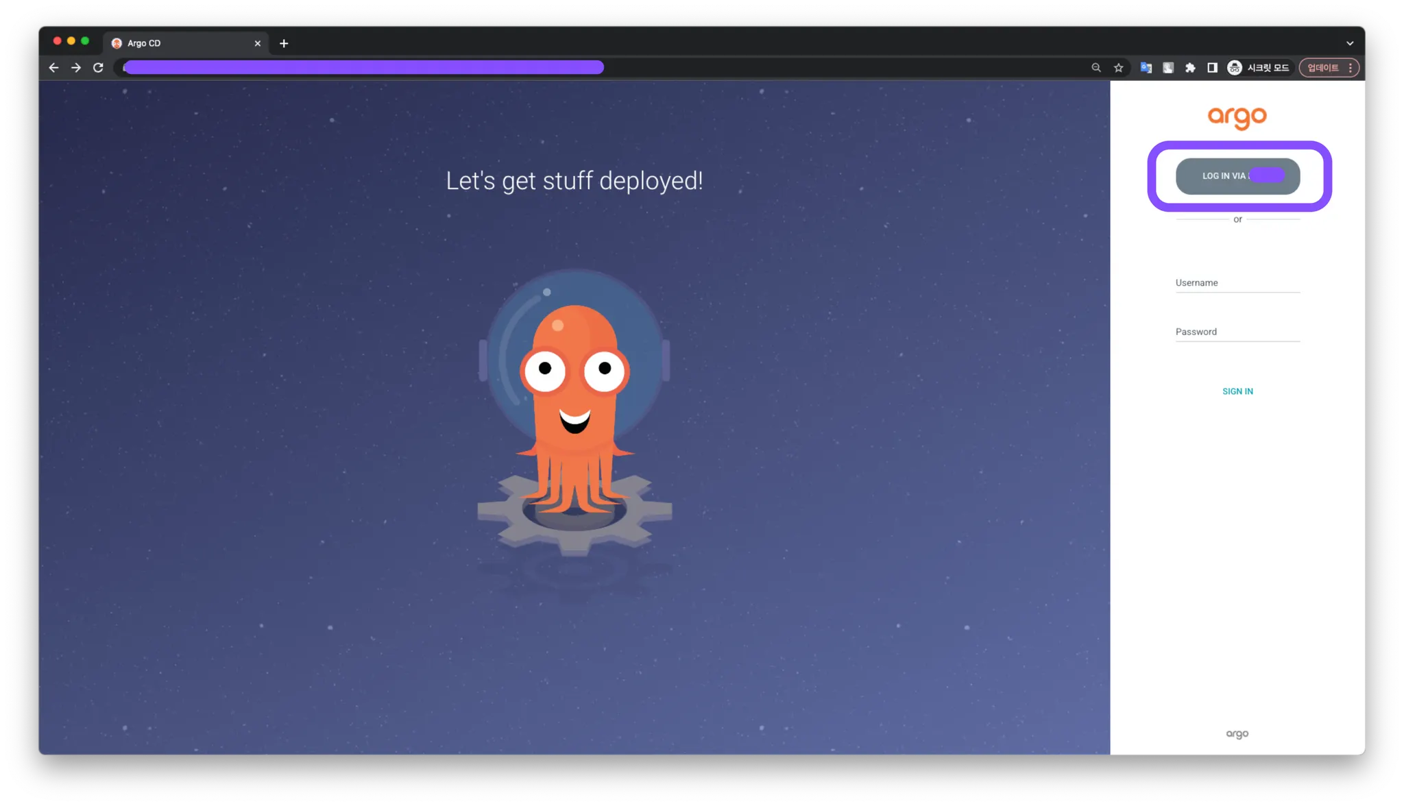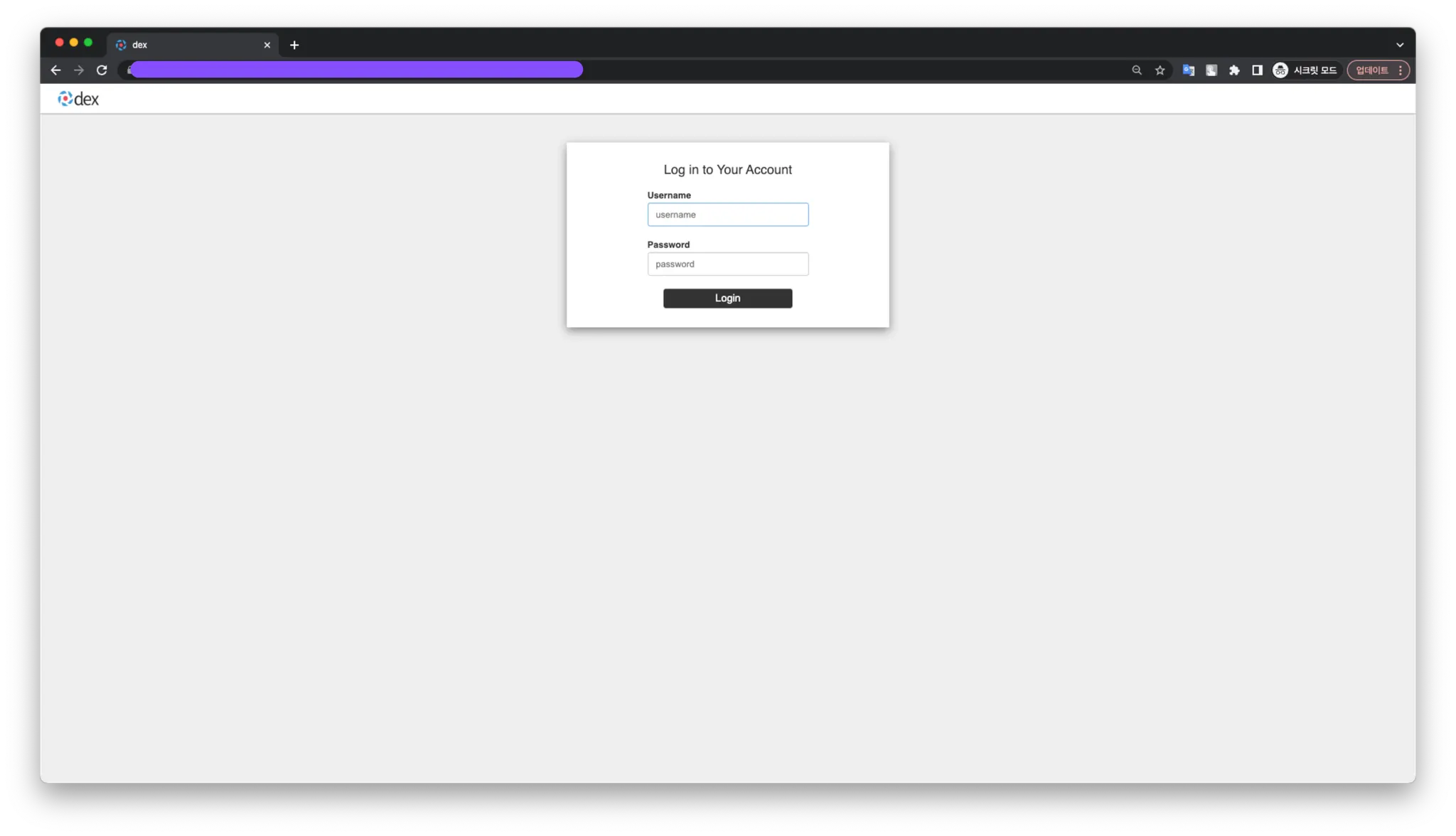 이제 Argo CD Web UI에 접속하면 LOG IN VIA ... 로 dex.config에 설정했던 connector의 이름이 나타나게 됩니다. 해당 버튼을 누르면 별도의 로그인 페이지가 나오고, 사내 시스템에서 사용하고 있는 계정/패스워드를 사용해서 로그인이 된다면 성공적으로 설정된 것입니다.