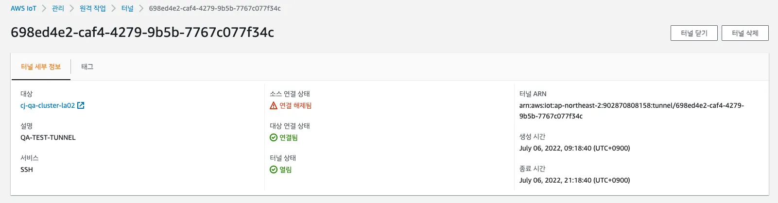 터널 생성이 완료되고, 터널 정보를 확인하면 아래 그림과 같다. 만약 Destination 디바이스의 aws-iot-device-client가 실행 중이고, 터널이 생성된 메시지를 토픽으로부터 수신했다면 대상(Destination) 연결 상태가 연결됨으로 표시됩니다.