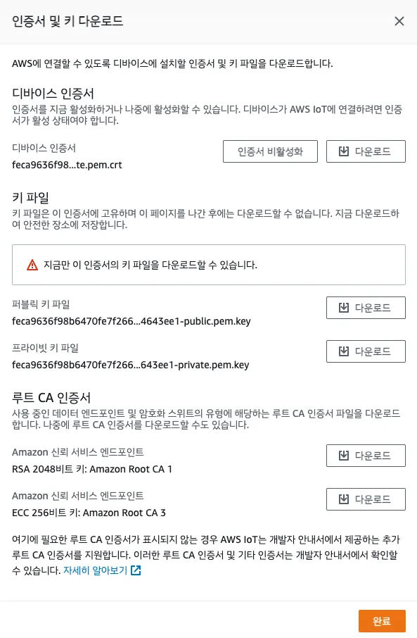 디바이스 인증서 / 프라이빗 키 / 루트 CA 인증서 디렉토리: chmod 700