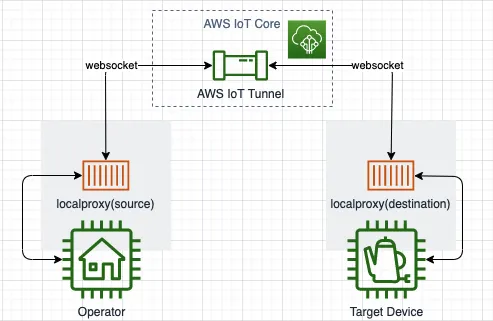 AWS IoT Secure Tunneling을 통해 양방향 연결이 성립되는 과정을 나타내면 아래와 같습니다.