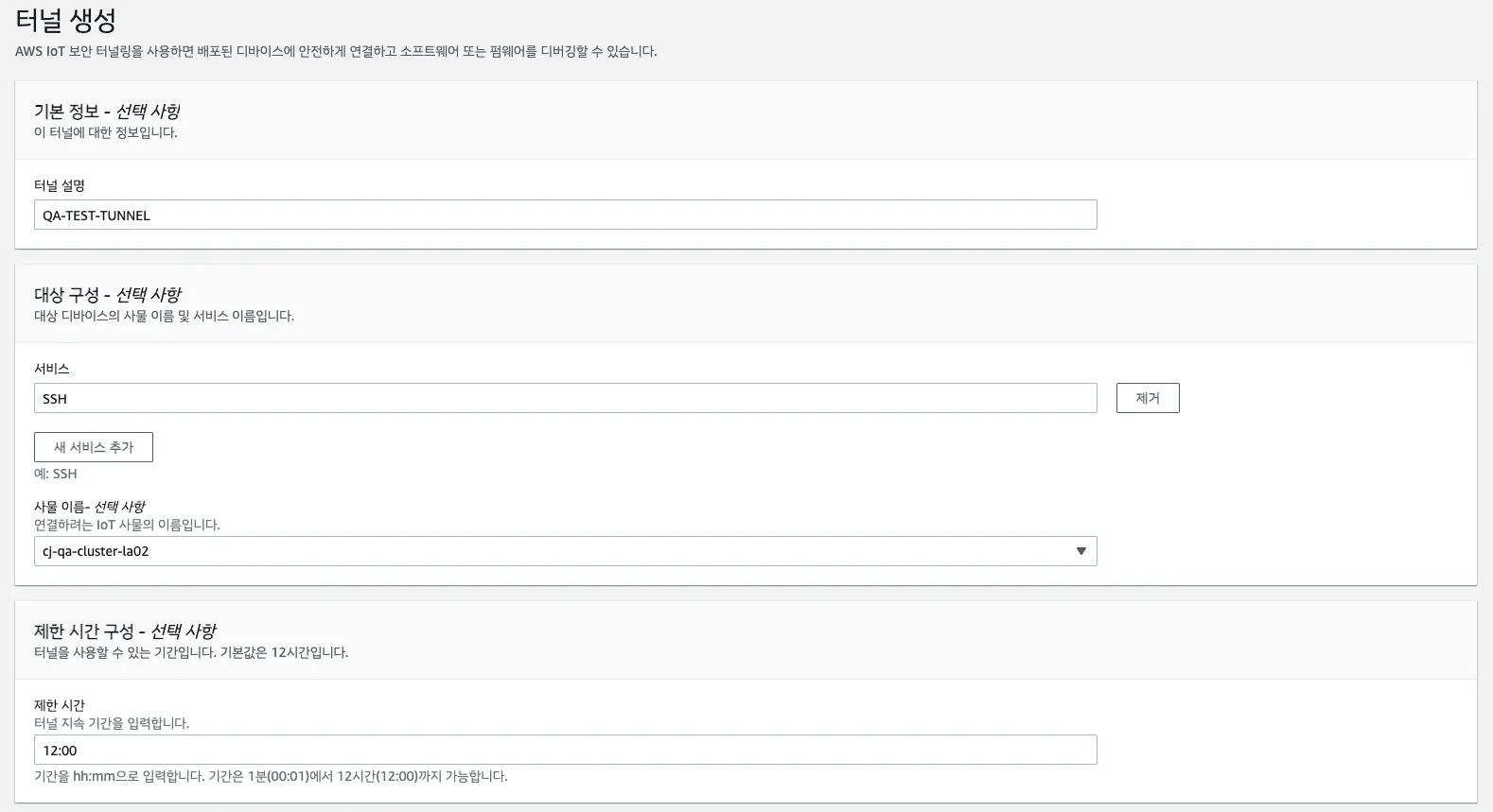 아래를 참고하여 터널 이름, SSH를 사용할 것이므로 SSH, 등록한 Destination 디바이스를 사물로 선택하고, 터널 유지시간을 설정합니다.