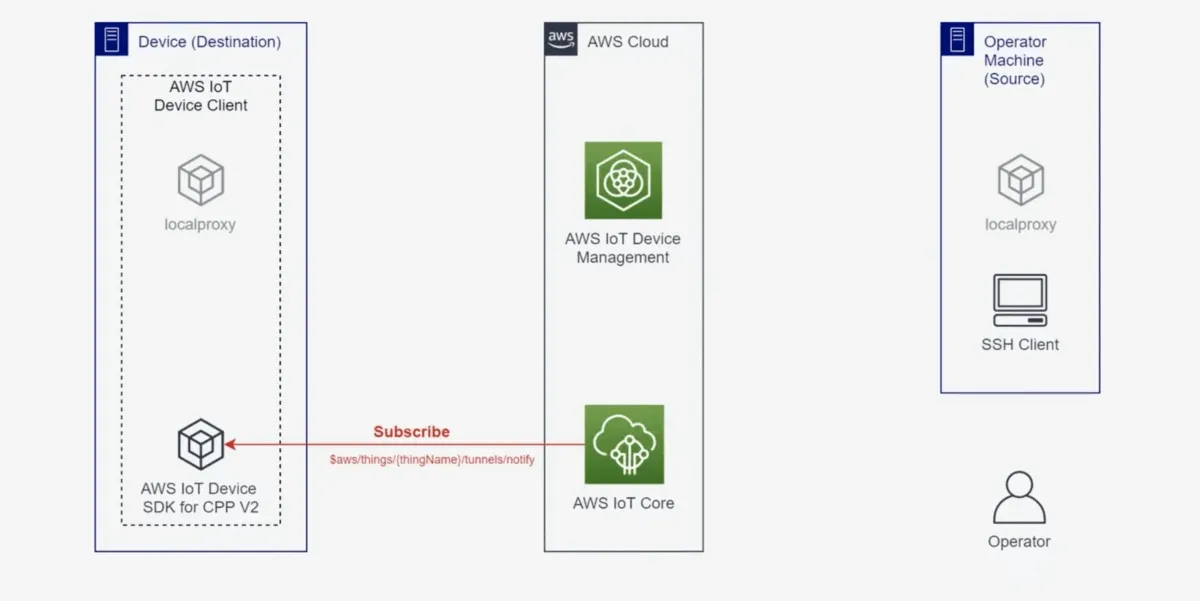 Destination 디바이스에서는 Device Agent가 실행 중이며, Device Agent는 미리 정의된 MQTT 토픽을 구독 중 ($aws/things/thing-name/tunnels/notify)