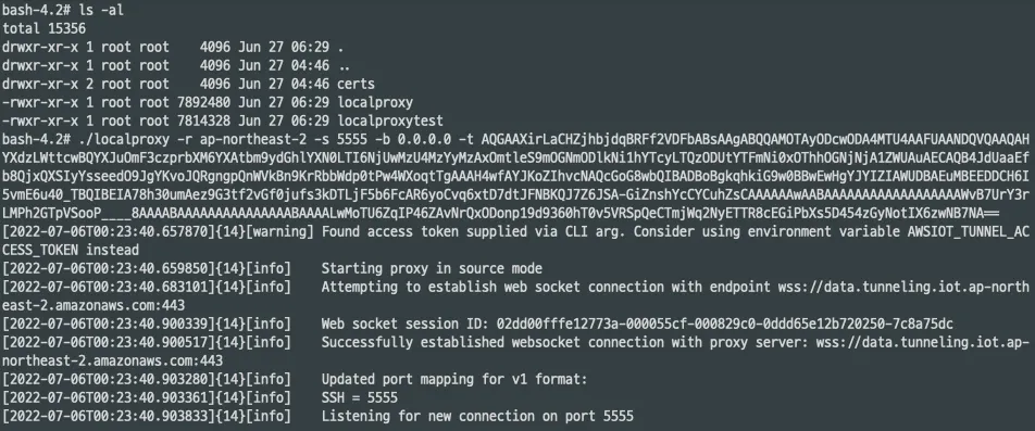 연결이 잘 되면 소스 모드 localproxy는 다음과 같은 로그를 볼 수 있고,