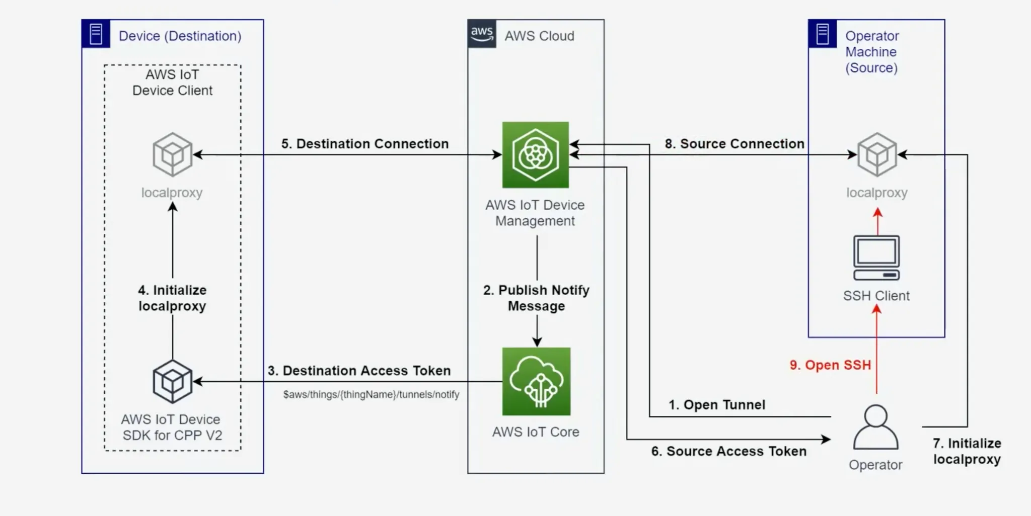 1)Local Proxy 와 Secure Tunnel의 통신 방법, 2)Device Agent의 구현 방식에 대해 설명해야하지만, 여기서는 터널에 양방향 연결이 성립되는 순서만 짚고 넘어가겠습니다.