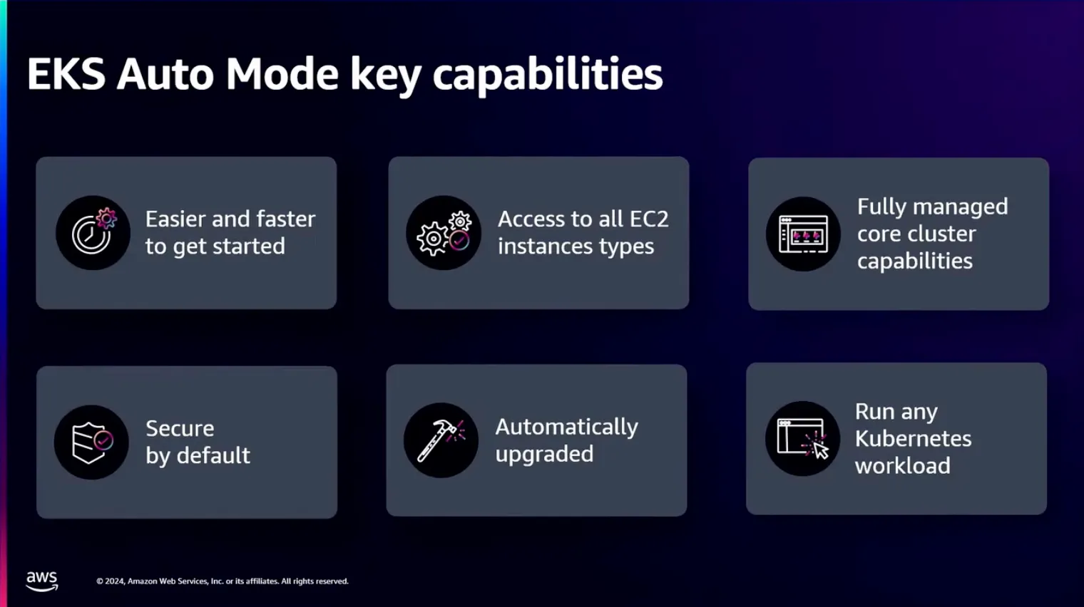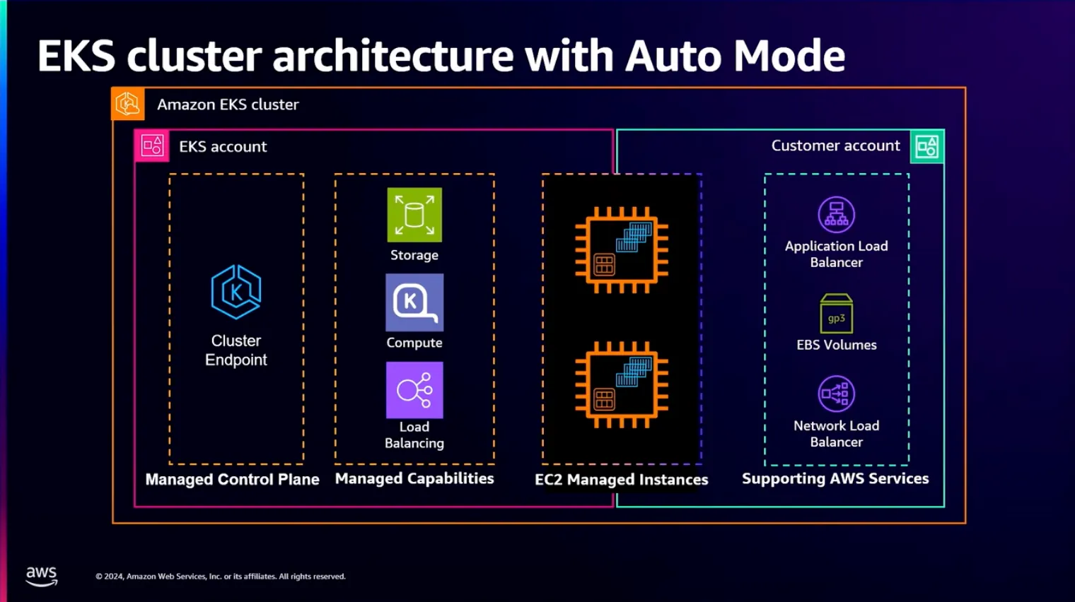 추가로 지난 24년 12월 5일, AWS re:Invent의 The future of Kubernetes on AWS (KUB201) 세션에서 EKS Auto Mode 에 대한 내용도 있었습니다.
